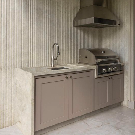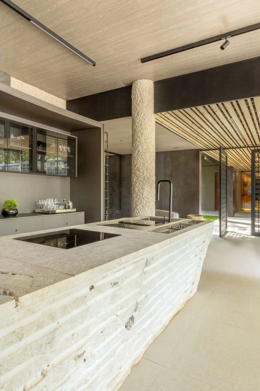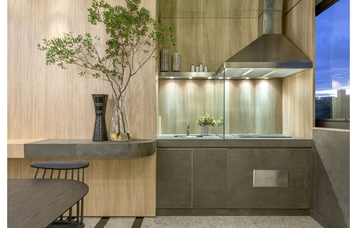 No piso foi usado o mármore Bege Bahia com o acabamento levigado, ele possui como característica uma durabilidade que permite ser usado em áreas externas e internas. Já na cozinha o mármore Nebbia White foi utilizado por possuir uma excelente resistência além de sua beleza natural. Contudo, como revestimento foi utilizado o quartzito Creme Kalahari, um material exótico que possui como característica seus veios em tons de rosa, cinza e bege.